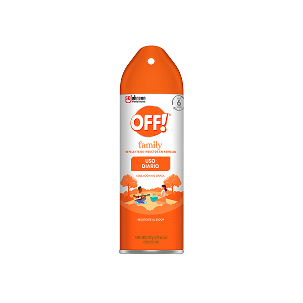 OFF! Family en su presentación en aerosol, te da hasta 6 horas de protección continua contra los mosquitos. Se recomienda volver a aplicar pasadas las 6 horas si continúa expuesto a picaduras de mosquitos. Este producto de uso diario es de fácil aplicación para cobertura homogénea sobre la piel, no deja efecto grasoso, y es resistente al agua y la transpiración.