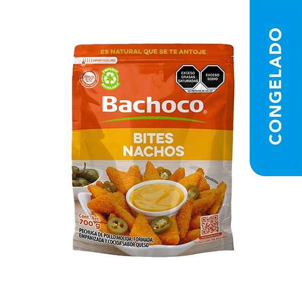 Nuggets de pechuga de pollo, empanizados, cocidos en forma de nachos sabor queso, listos para calentar y disfrutar. Producto se entrega congelado. Manténgase en congelación a -18°C
