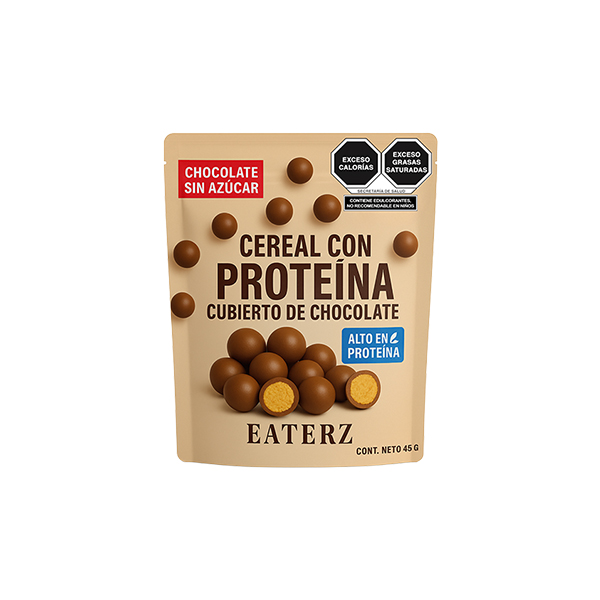 Cereal con proteína sabor vainilla cubierto de chocolate con leche sin azúcar.