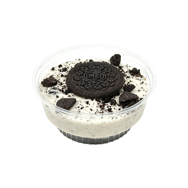 Postre frío elaborado con una base crujiente de galleta Oreo y una crema suave de queso con toques de vainilla y trozos de galleta. Decorado con fragmentos de Oreo en la superficie. Preparado en frío para conservar su sabor y textura cremosa.
